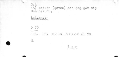 //// Och //// (Å) bocken (geten) den jag gav dig den har du, //// Lekéans% //// D 70 //// 1:5. RE. S.L.S. 63 s.98 nr 20. m N. //// ÅBO ////