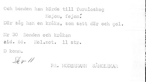 //// Och bonden han körde till furuloskog //// Hej om, fejorru Där såg han en kråka, som satt där och gol. //// Nr 30 Bonden och kråkan //// aid. 66. Mel.not. II str. \ //// D komm. \ //// PR. NODERMANN SANGLEKAR ////