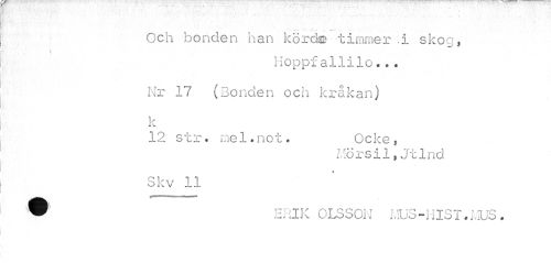//// • ¦ //// Och bonden han körde timmer .i skoo, //// \ //// Hoppfallilo... Nr 17 (Bonden och kråkan) k //// 12 str. mel.not. Ocke, //// Mörsil,Jtlnd //// Skv 11 //// • ERIK OLSSON MUS-HIST.KUS. ////