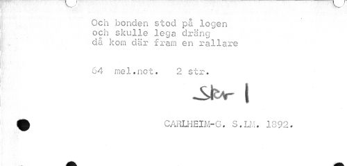 //// « //// Och bonden stod på logen och skulle lega dräng då korn där fram en rallare //// 64 mel.not. 2 str. A CARLHEIM-G. S.LM. 1892. ////