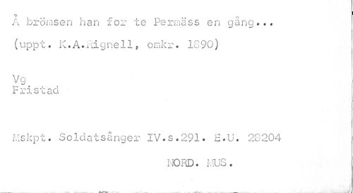 //// o //// A bromsen han for te Permäss en gäng*.* (uppt. K.A.Rignell, ornkr. 1890) //// < //// Vg i //// Fristad ¦ | //// t \ //// Mskpt. Soldatsånger IV.s.291. E.U. 28204 //// NORD. MUS. //// n //// ___ , - - j ////