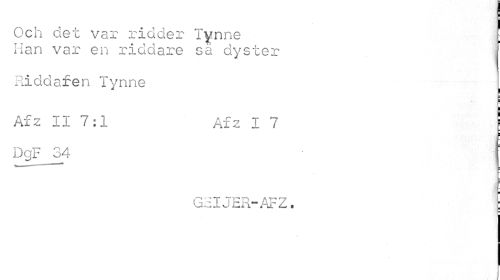 //// Och det var ridder Tynne [ //// Han var en riddare sa dyster j //// Riddaren Tynne //// Af z II 7:1 Af z I 7 j //// DgF 34 I //// G2IJER-AFZ. ; ////