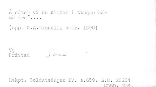 //// ¦ //// O //// A efter vi nu sitter i stugan här ma fre //// (uppt K. A.~iignell, ornkr. 1890) //// \ //// \ //// Vg l //// Fristad J //// IAskpt. Soldatsånger IV. s.659. E.U. 28204 //// KIORH. m IS . ////