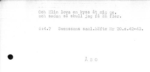 //// - ¦ • -. - v • ¦ - - - //// V //// •- - »¦ " ¦ ¦'•¦ ... ..." .T //// - //// Och Elin loya en kyss åt mig ge, och seclan så skull jag få än fler. //// 6:4.? Svenssons saml.häfte Nr 20.s.42-43. //// » ////