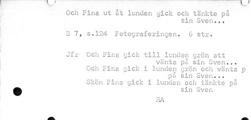 //// Och Fina ut åt lunden gick och tänkte på //// sin Sven *«. //// B 7, s.124 Fotograferingen. 6 str. //// Jfr Och Fina gick till lunden grön att //// vänta på sin Sven... Och Fina gick i lunden grön och vänta p //// på sin Sven... Skön Fina gick i lunden och tänkte på ^ sin Sven //// RA ////