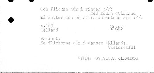 //// Och flickan går i ringen ://: //// med rödan gullhand //// mmf //// ^ så knyter hon om allra kärastens arm ://: //// s .169 Q i<s r //// Halland v //// Variant: //// Se flickorna går i dansen (Kilanda, //// Västergtld) //// STRÖM SV.VISOR olRAMSOR ////