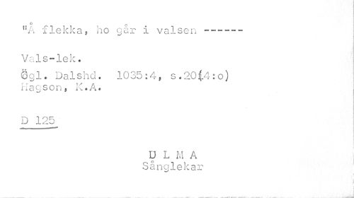 //// O c //// "A flekka, ho gar i valsen--- //// i- 4 //// Vals-lek. //// 0gl. Dalshd. 1035:4, s.20(4:o) //// I la c. son, K. A. //// D 125 -- //// D L M A //// Sånglekar ////