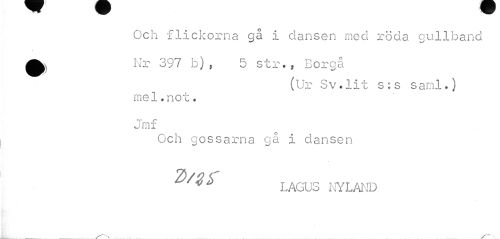 //// Och flickorna gå i dansen med röda gullband //// ? //// ^^ Nr 397 b), 5 str., Borgå //// (Ur Sv.lit s;s saml.) //// mel.not. //// ~r c //// j mx //// Och gossarna gå i dansen //// ^^ LAGUS NYLAND ////
