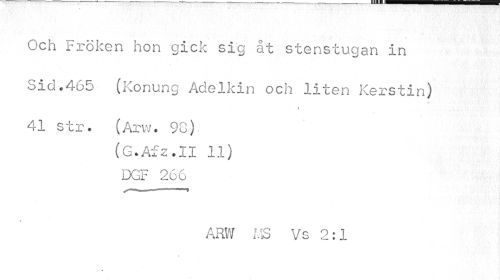 //// Och Fröken hon gick sig åt stenstugan in //// Sid.465 (Konung Adelkin och liten Kerstin) //// i //// 41 str. (Arw. 90). //// (G.Afz.II 11) //// DGF 266 //// ARW 1.3 Vs 2:1 ////
