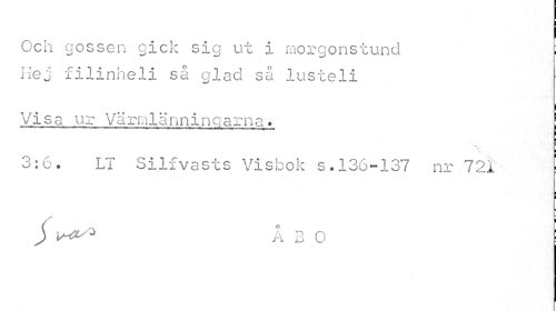 //// Och gossen gick sig ut i morgonstund Hej filinheli så glad så lusteli //// Visa ur Värmlänningarna* //// »»•^¦•¦a» ...¦»" ...B0tm. ¦ ¦ ¦¦ ¦ <n i m ' w ^ //// l //// 3:6. LT Silfvasts Visbok s.136-137 nr 721 ' //// i i //// J ÅBO ! ////