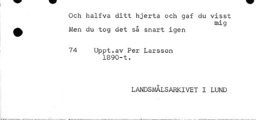 //// Och halfva ditt hjerta och gaf du visst //// mig //// ^ Men du tog det så snart igen //// 74 Uppt.av Per Larsson //// 1890-t• //// LAIOSMALSARKIVET I LUND ////