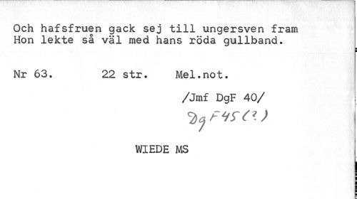 //// Och hafsfruen gäck sej till ungersven fram Hon lekte så väl med hans röda gullband. //// i ¦ //// Nr 63. 22 str. Mel.not. //// /Jmf DgF 40/ j //// ^afiS-O.) //// WIEDE MS ////