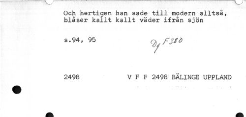 //// Och hertigen han sade till modern alltså, blåser kallt kallt väder ifrån sjön //// s.94, 95 //// 2498 V F F 2498 BÄLINGE UPPLAND //// - - ////