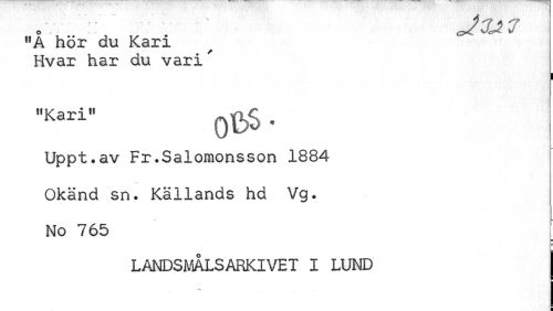 //// o v " " • r JJJ7 //// "A hör du Kari //// Hvar har du vari' //// i //// "Kari" qB$ . //// Uppt.av Fr•Salomonsson 1884 Okänd sn. Källands hd Vg. No 765 //// ¦ //// LANDSMÅLSARKIVET I LUND I ////