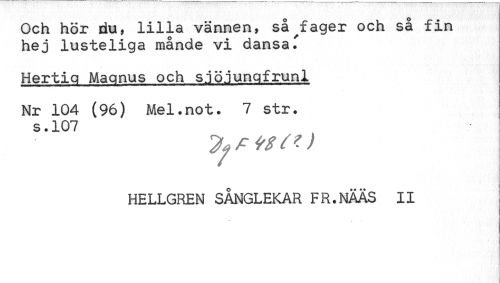 //// Och hör du, lilla vännen, så^fager och så fin hej lusteliga månde vi dansa T //// Hertig Magnus och sjöjungfrun! //// Nr 104 (96) Mel.not. 7 str. s .107 //// I //// HELLGREN SÅNGLEKAR FR.NÄÄS II //// j //// 1 •'I //// i ////