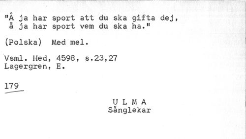//// \m //// ¦ //// 11A ja har sport att du ska gifta dej, å ja har sport vem du ska ha»11 //// (Polska) Med mel» //// Vsml. Hed, 4598, s.23,27 Lagergren, E. //// 179 //// U L M A Sånglekar ////