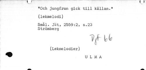 //// / V. //// "Och jungfrun gick till källan." (lekmelodi) //// Smål. Jät, 2559:2, s.23 Strömberg //// (Lekmelodier) //// U L M A ////