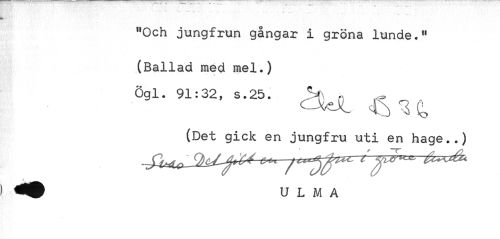 //// "Och jungfrun gångar i gröna lunde." //// (Ballad med mel.) //// \ ™ //// Ögl. 91:32, S.25. 5* r //// (Det gick en jungfru uti en hage..) ////