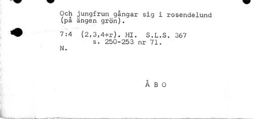 //// Och jungfrun gångar sig i rosendelund (på ängen grön). //// 'k ... .« //// ^ 7:4 (2,3,4+r). Hl. S.L.S. 367 //// s. 250-253 nr 71. ' //// N. //// ÅBO ////