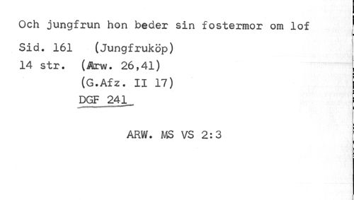 //// Och jungfrun hon beder sin fostermor om lof I //// I //// Sid. 161 (Jungfruköp) //// 14 str. (Arw. 26,41) , //// (G.Afz. II 17) | //// DGF 241_ | //// ARW. MS VS 2:3 j ////