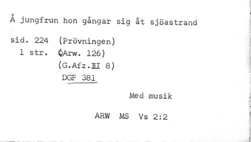 //// 1 //// A jungfrun hon gångar sig åt sjöastrand //// i a //// sid. 224 (Prövningen) 1 str. <§Arw. 126) //// (G.Afz.21 8) //// DGF 381 i //// m^^mmmmmmmrnm** //// Med musik //// . //// ARW MS Vs 2:2 //// I ////