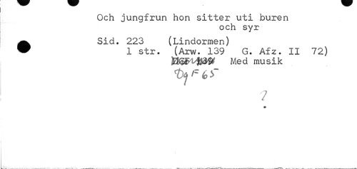 //// Och jungfrun hon sitter uti buren //// och syr //// •Sid. 223 (Lindormen) //// 1 str. (Arw. 139 G. Afz. II 72) //// VfäSAjmt Med musik //// t>yz<of //// 7 * ////