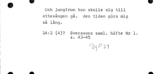 //// Och jungfrun hon skulle sig till ottesången gå, den tiden görs mig så lång. //// 24:2 (4)? Svenssons saml. häfte Nr 1. //// s. 43-45 //// ^ 37 ////