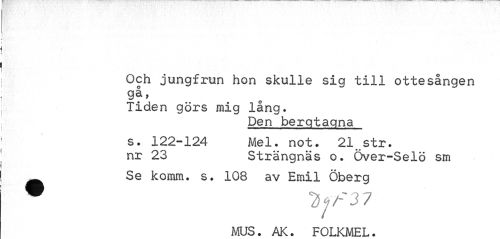 //// Och jungfrun hon skulle sig till ottesången gå, //// Tiden görs mig lång. //// Den bergtagna //// s. 122-124 Mel. not. 21„str. //// nr 23 Strängnäs o. Över-Selö sm //// Se komm. s. 108 av Emil Öberg //// • *Z<f/-37 //// MUS. AK. FOLKMEL. ////