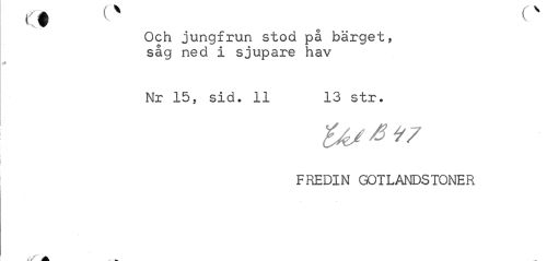 //// ct v o v //// Och jungfrun stod på bärget, såg ned i sjupare hav //// * //// Nr 15, sid, 11 13 str. //// FREDIN GOTLANDSTONER //// A ////