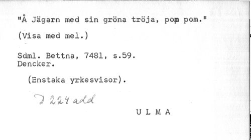 //// "Å Jägarn med sin gröna tröja, pop pom." //// (Visa med mel.) 5 //// Sdml. Bettna, 7481, s.59. Dencker. //// (Enstaka yrkesvisor). //// 1 ZZ H*AA //// U L M A : ////