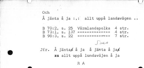 //// « //// Och //// A jänta å ja :,: allt uppå landavägen .. //// B 70:2, s. 25 Värmlandspolka 4 str. //// B 73:1, s. 137...--- 4 str. //// B 98:3, s. 22 ---- 7 str. //// ^ Jfr. Å jänta/ å ja å jänta å ja/ //// he allt uppå lundaväjen å ja //// R A ////