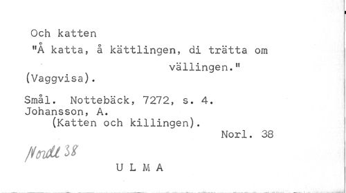 //// 1 //// I //// Och katten //// HÅ katta, å kättlingen, di trätta om //// vällingen.11 //// (Vaggvisa). //// Smål. Nottebäck, 7272, s. 4. Johansson, A. //// (Katten och killingen). //// Norl. 38 //// ftftiU W //// U L M A ////