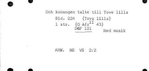 //// Och konungen talte till Tove lilla Sid. 224 (Tova lilla) //// 1 str. (G Afz11 43) //// DGF 121 .. , .. //// Med musik //// f //// ARW. MS VS 2:2 ////