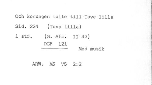 //// Och konungen talte till Tove lilla //// i //// Sid. 224 (Tova lilla) I //// 1 str. (G. Afz. II 43) j //// | //// DGF 121 //// --- Med musik //// ARW. MS VS 2:2 ////