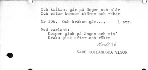 //// p //// Och kråkan, går på ängen och slår Och efter kommer skären och rakar //// Nr 106, Och kråkan går..., 1 str. //// Med variant: //// Korpen gick på ängen och slo' Kraku gick efter och räkte //// SÄVE GOTLÄNDSKA VISOR ////