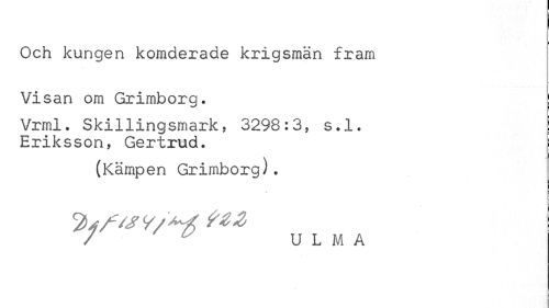 //// Och kungen komderade krigsmän fram Visan om Grimborg. //// Vrml. Skillingsmark, 3298:3, s.l. ! //// Eriksson, Gertrud. [ //// (Kämpen Grimborg). ////