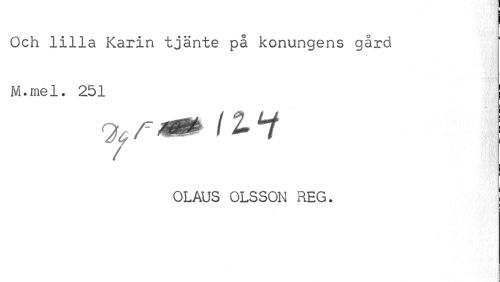 //// I //// Och lilla Karin tjänte på konungens gård ' //// M.mel. 251 //// OLAUS OLSSON REG. j ////