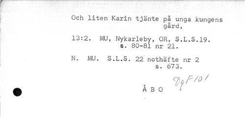 //// Ii //// Och liten Karin tjänte på unga kungens //// gård, //// 13:2. MU, Nykarleby, OR, S.L.S.19. //// S. 80-81 nr 21. //// N. MU. S.L.S. 22 nothäfte nr 2 //// s. 673. //// a A B O C ////