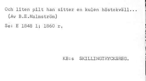 //// I //// Och liten pilt han sitter en kulen höstekväll... (Av B.E.Malmström) //// Se: E 1848 1; 1860 r, ! //// i //// i ¦ //// i //// i ¦ //// i //// KB:s SKILLINGTRYCKSREG. i //// il ////