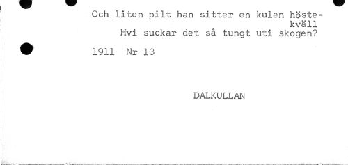 //// Och liten pilt han sitter en kulen höste- //// o kväll //// Hvi suckar det sa tungt uti skogen? W 1911 Nr 13 //// DALKULLAN ////