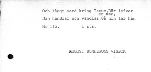 //// Och- långt nord kring Tanum,Där lefver //// en man, //// Han handlar och vandlar,Så hin tar han Nr 115, 1 str. //// AUGUST BONDESONS VISBOK //// <\ ... v. -r ////