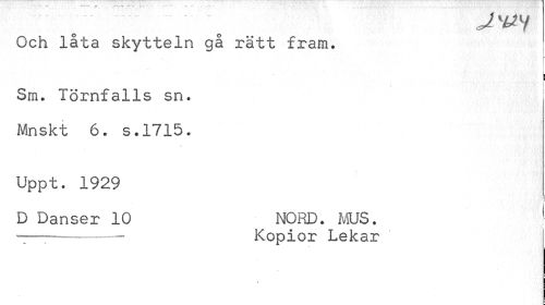//// Och låta skytteln gå rätt fram. //// | //// Sm. Törnfalls sn. //// 4 //// Mnskt 6. s.1715. //// Uppt. 1929 //// D Danser 10 NORD. MUS. - //// -----Kopior Lekar ////