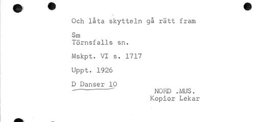 //// b //// Och låta skytteln gå rätt fram Sm //// Törnsfalls sn. Mskpt. VI s. 1717 Uppt. 1926 D Danser 10 //// •---" NORD .MUS . //// Kopior Lekar //// t //// M m\ ////