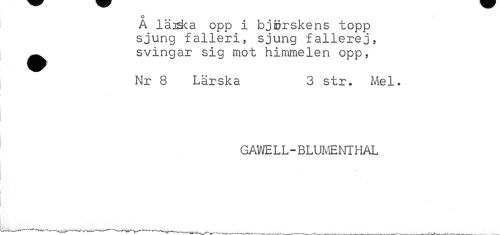 //// o //// A 1 ände a opp i björskens topp sjung falleri, sjung fallerej, ^^ svingar sig mot himmelen opp, //// Nr 8 Lärska 3 str. Mel. //// GAWELL-BLUMENT HAL ////