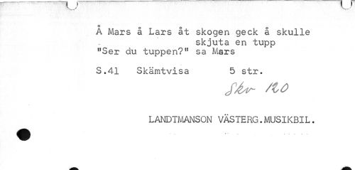 //// • r \ .' //// O //// A Mars å Lars åt skogen geck å skulle //// skjuta en tupp "Ser ciu tuppen?" sa Mars //// S.41 Skämtvisa 5 str. //// /tO //// LANDTMANSON VÄSTERG.MUSIKBIL. ////