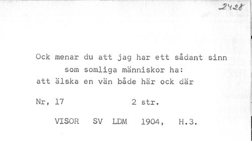 //// i //// Ock menar du att jag har ett sådant sinn //// som somliga människor ha: att älska en vän både här ock där //// Nr, 17 2 str. //// VISOR SV LDM 1904, H.3. ////
