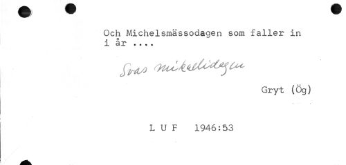 //// fj ^^ ^ //// Och Michelsmässodagen som faller in //// » O //// i ar • • • • //// Gryt (Ög) //// L U F 1946:53 ////