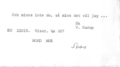 //// Och minns inte du, så mins det väl jag ... //// Sk 1 //// V. Karup //// EU 22015. Visor, V,s 387 //// NORD MUS //// -J 1/-Ö-0 ' //// I //// ¦ " ////