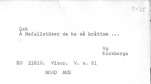 //// Och //// Å Mofallstöser de ha så bråttom ... //// /•v //// vg //// Korsberga //// EU 21810. Visor. V. s. 81 //// NORD MUS | ////