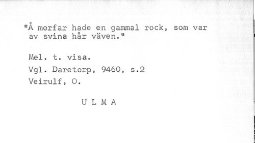 //// v //// o //// "A morfar hade en gammal rock, som var av svina hår väven." //// Mel. t. visa. //// Vgl. Daretorp, 9460, s.2 //// Veirulf, O. //// U L M A //// I i ¦ //// ¦ ////